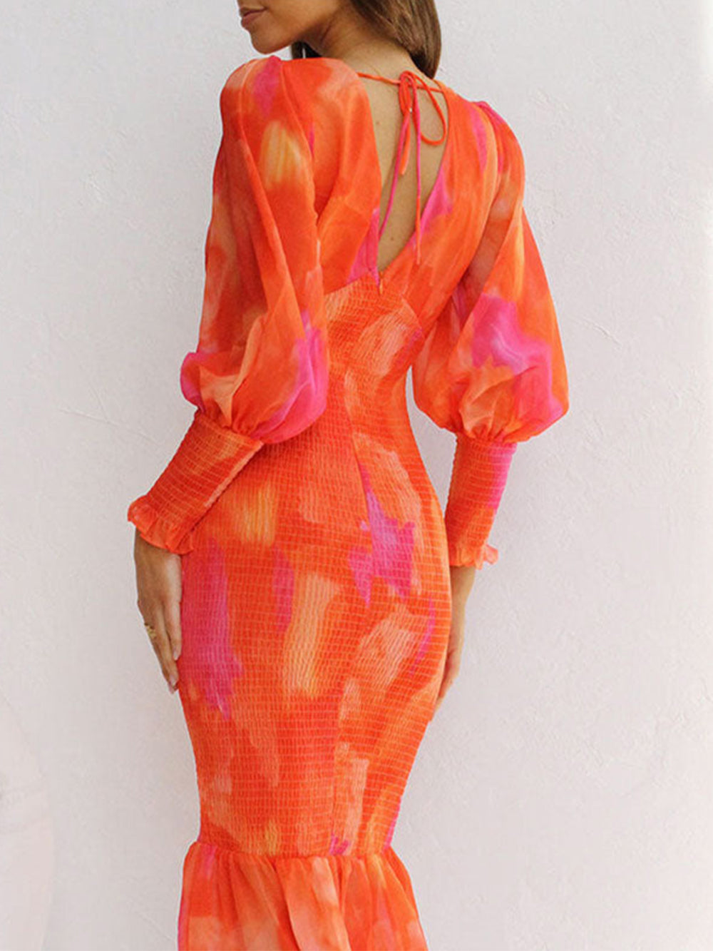 Tie Shoulder Fishtail Hem Floral Print Prom Dress