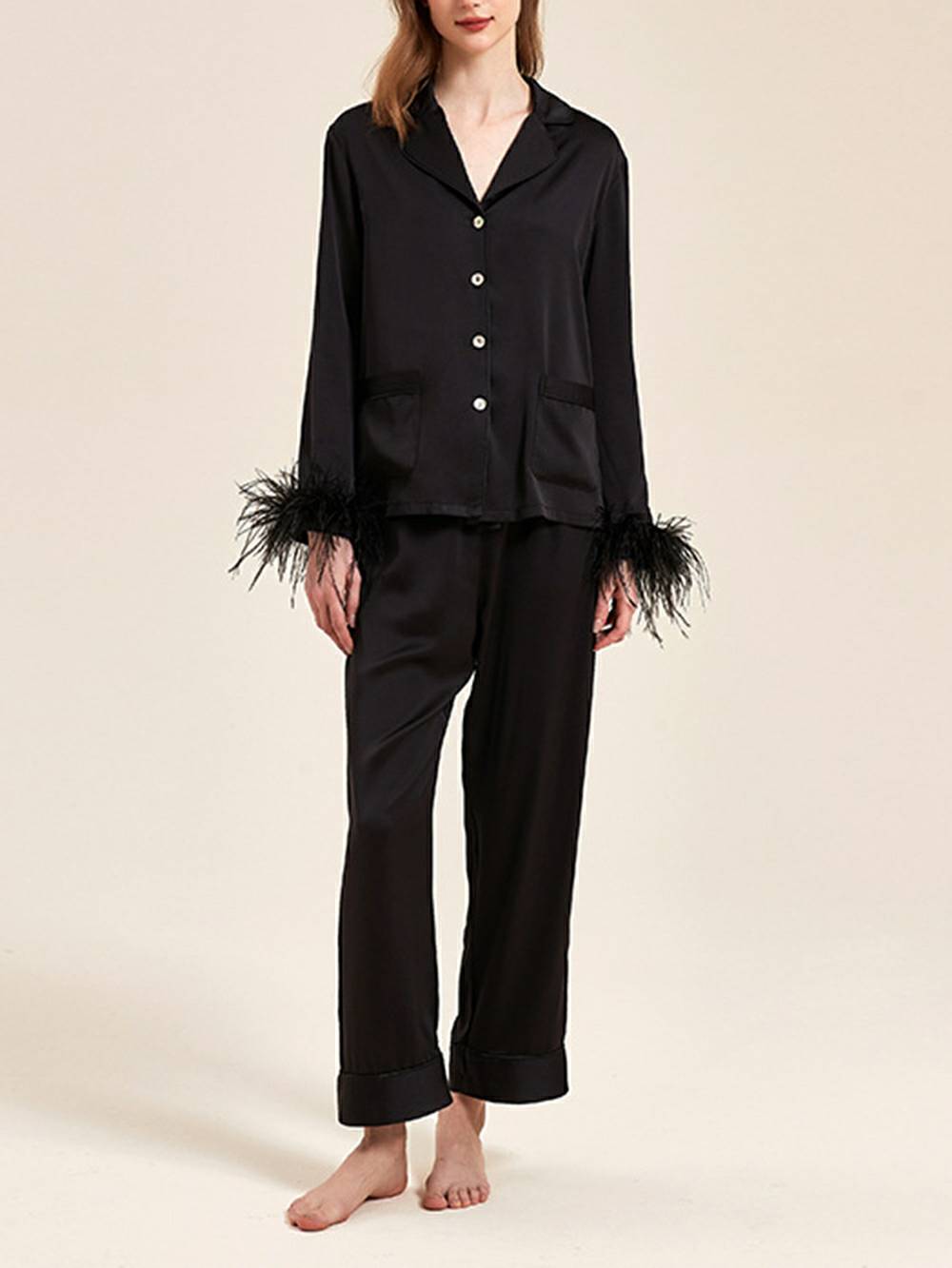 Who knew Morning could look this cute?! This set includes cozy tie waist pants, a super soft bejeweled button-down top, and fabulous feather cuffs. Did we mention that the feather cuffs are detachable to make for an easy wash? Slip into our Kris Kringle Pajamas Set after a long day, because you've earned it! Also makes the perfect gift for your girl gang!