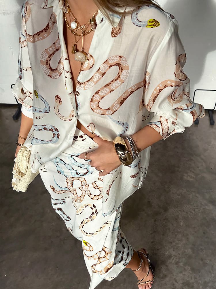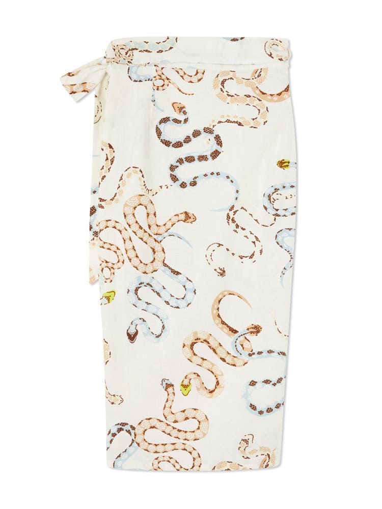 This skirt set with an adjustable wrap waist, which means SO much versatility with styling. It features exclusive print designs, created by our in-house team. Snakes are a key element of our favorite manifestation theme (we like to hint towards it in everything we make), it feels quite grounded and balances out the femininity of the silhouette.