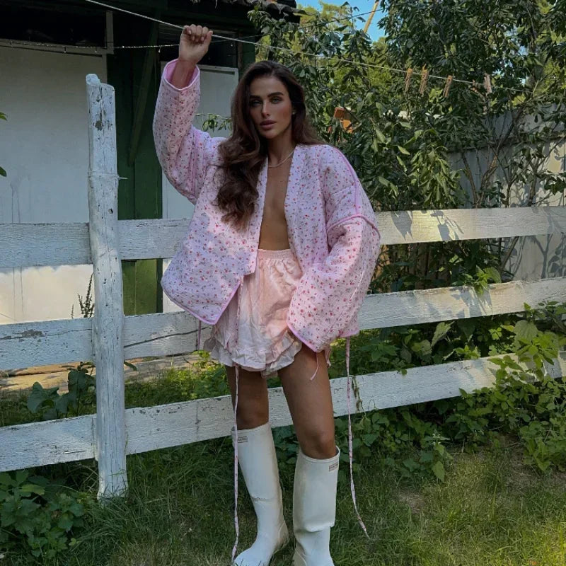 Cute Pink Floral Lace-Up Loose Quilted Jacket. loose shoulder version. lazy casual. suitable for lounging on the street. The front end has a tie that can be tied into a bow. and the sleeves are loose and can be rolled up at will. It can be worn with any outfit. from skirts to jeans to boots. With the perfect combination of comfort and fashion for cool weather. it can definitely become your most frequently worn jacket and is worth adding to your fall/winter wardrobe!