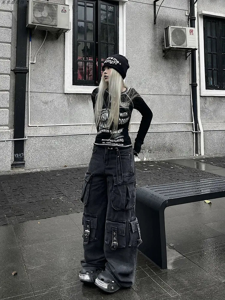 These deep-colored wide-leg jeans are a perfect blend of high-fashion street style and practical design. Crafted with heavy-duty denim, they feature multiple pockets for functionality, while the water-washed finish gives them a rugged, worn-in look. The wide-leg silhouette ensures a relaxed, comfortable fit, perfect for achieving a trendy yet laid-back appearance. Whether you're dressing up or down, these jeans add an effortlessly cool touch to any outfit.
